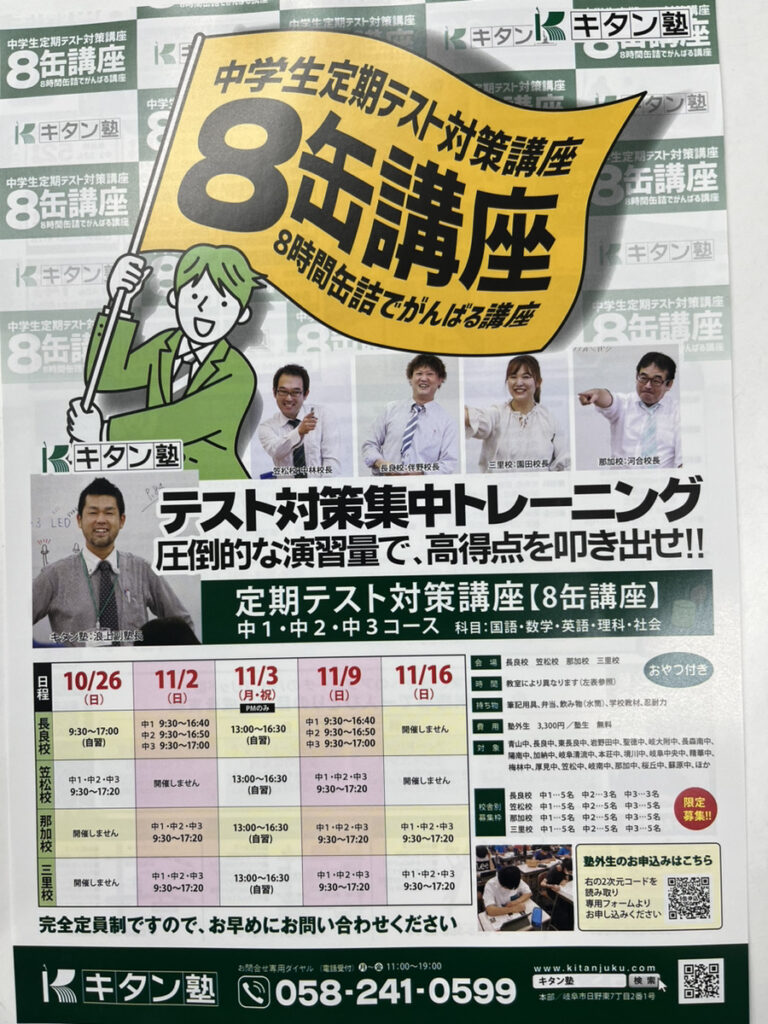 後期になって最初の定期テストが近づいてきました。前期に思うような成績がのこせなかった人は後期中間テストで弾みをつけたいところです。そこで、キタン塾本科コースでは定期テスト直前の日曜日を使って,「8缶講座」という定期テスト勉強会を開催しています。この講座は,「8時間缶詰でがんばる講座」の略称になりますが,圧倒的な演習量で高得点をたたきだすことを目的に、塾で8時間定期テスト勉強に集中して取り組む講座です。キタン塾の専任講師が学校のワークのお手伝いや,解けない問題の解説、苦手な単元の手助けをしてくれます。静かで集中できる学習環境なので,家庭では長時間勉強に集中できない生徒にぴったりの講座です。参加者には定期対策問題集をプレゼントいたします。また,当日は校舎担当の先生がそれぞれ考えた「おやつ」も用意されます。みなさまの参加をお待ちしています。