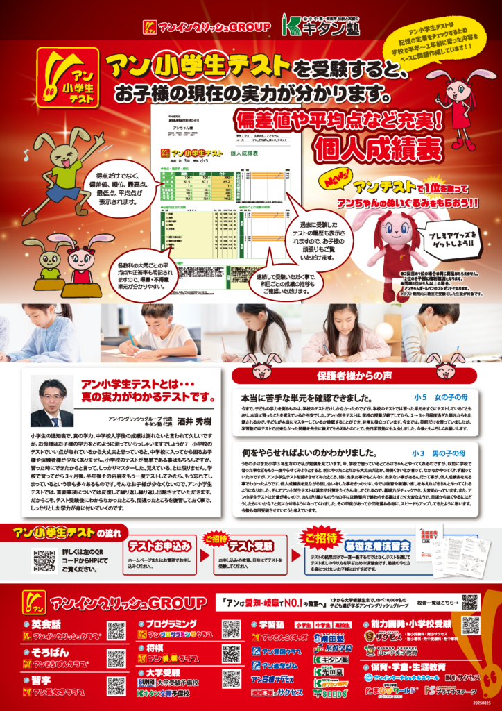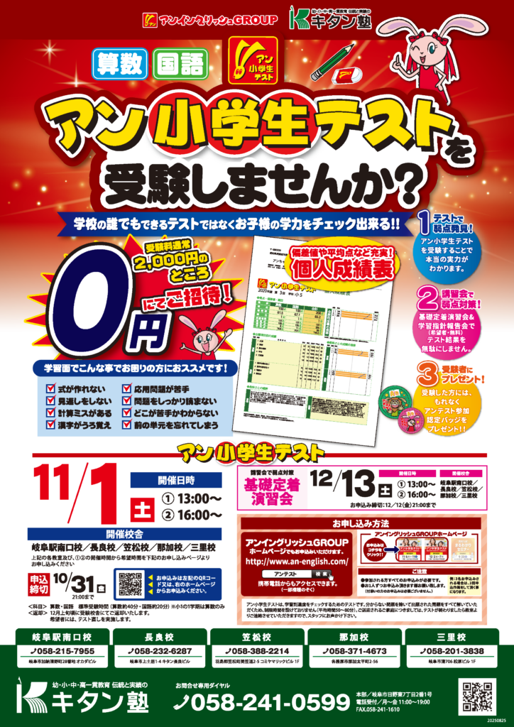 キタン塾では、11/1(土)に今年度2回目の小学生対象アンテストを開催いたします。